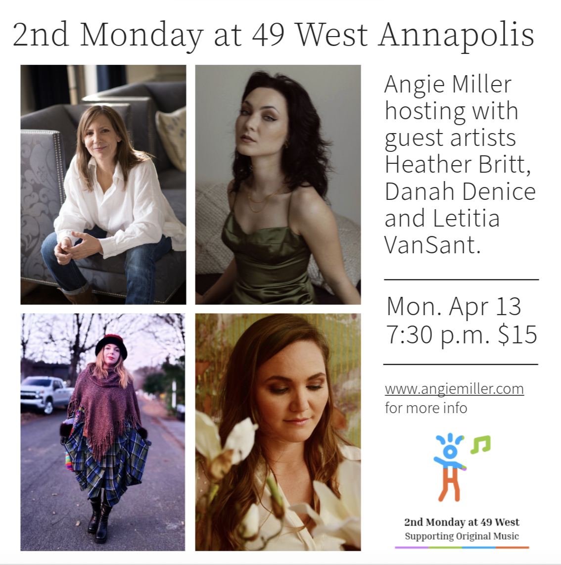 Angie Miller hosting with special guests Heather Britt, Danah Denice and Letitia VanSant. 2nd Monday at 49 West is a monthly concert series featuring local and regional songwriters. It's a chance to see some great artists up close and personal in the cozy back room of this downtown Annapolis coffeehouse and wine bar. Call 410-626-9796 for reservations. Visit the 49 West Coffeehouse and Winebar website for more info. $15 cover.